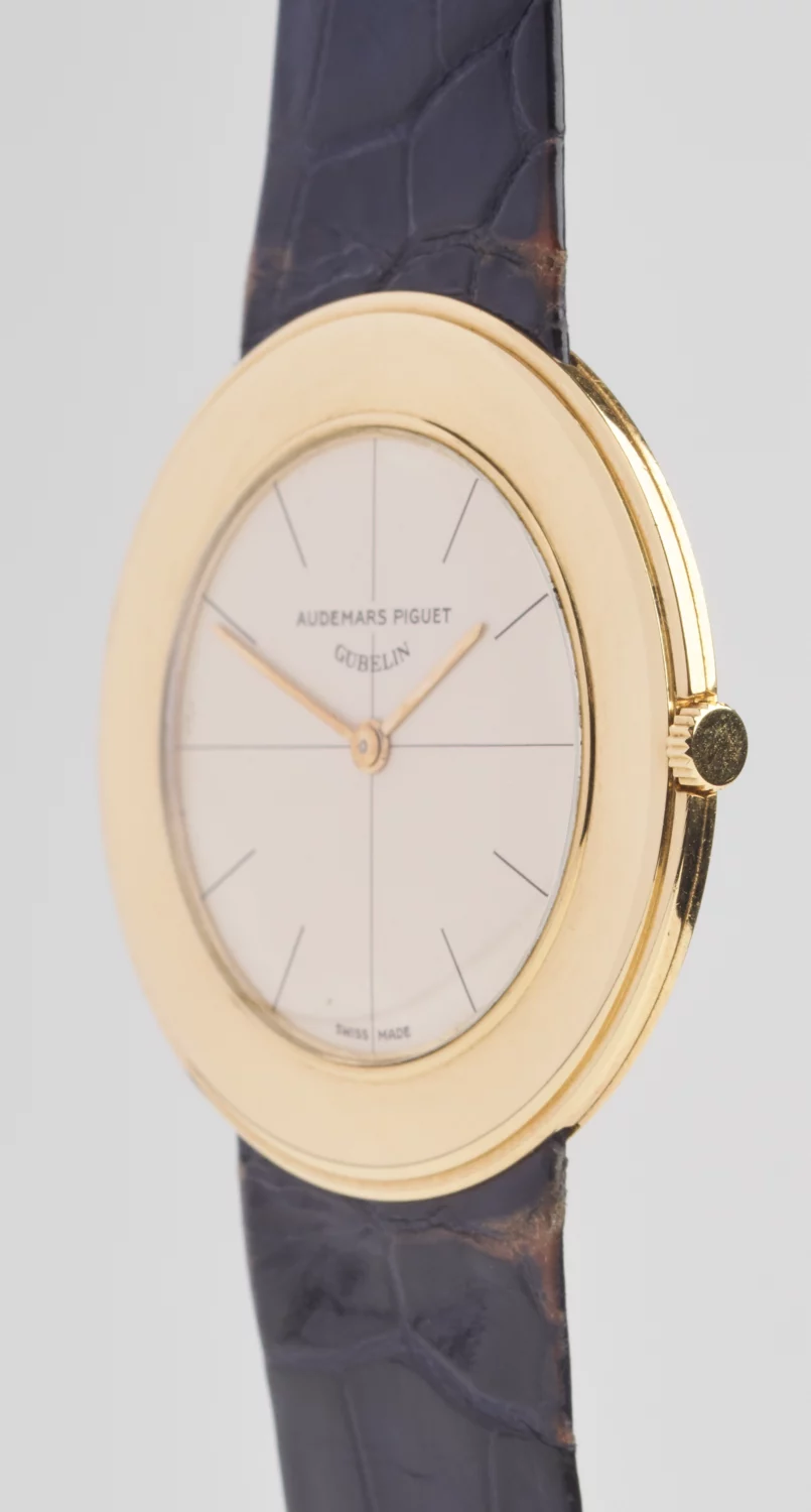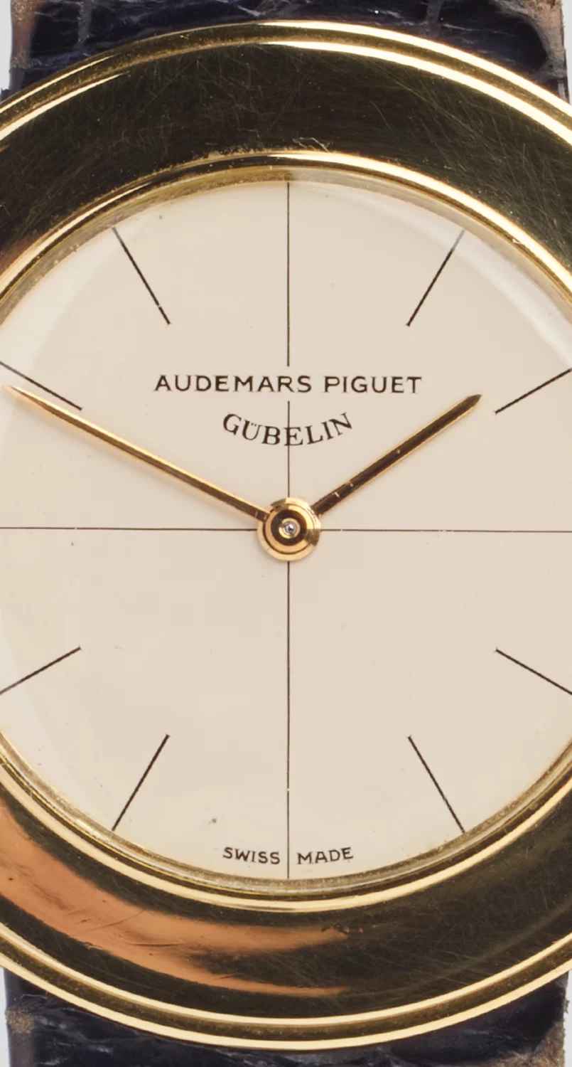 Audemars Piguet 5093 »Disco Volante,« featuring a stepped 18k yellow gold case with the characteristic thin, wide profile. This example is double-signed by Gübelin, adding notable collectability and provenance. Interestingly, we did not find a similar specimen with the »Gübelin«print being written in the same, semi-circular way as its seen on the watch here. The dial has aged gracefully, showing a light uniform patina and some blemishes around six and nine o’clock. The case remains well defined and shows only light signs of wear. The watch is powered by the manual-wind calibre 2003 movement and comes on a matching period leather strap with Antoine Wenger buckle as well as the original AP box.